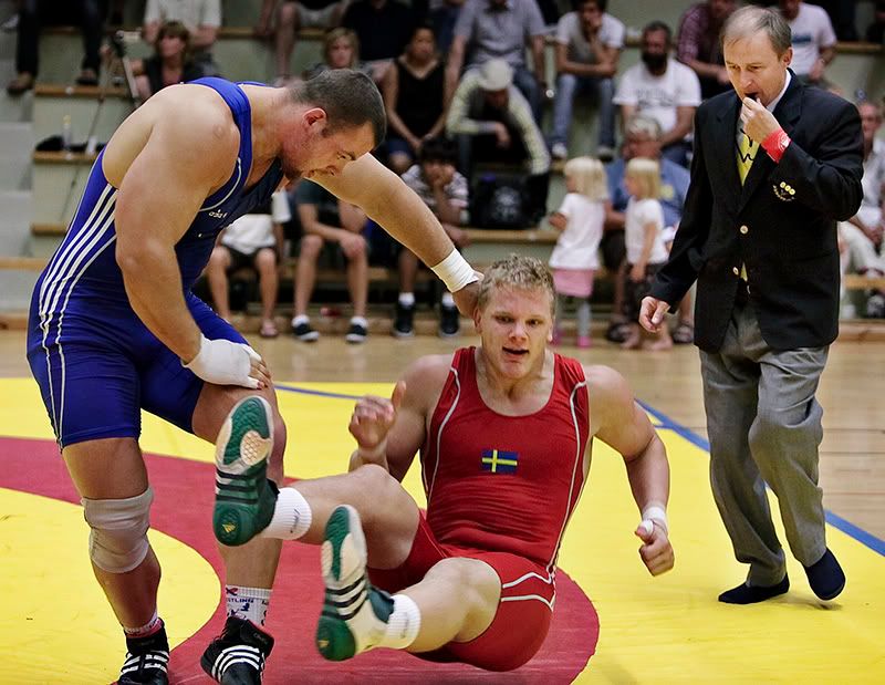Grabben i blå trikå, Jalmar Sjöberg är vårat hopp i kommande OS, han tar här en sväng-om på gula mattan med Sebastian Lönnborn. Förmodligen känns den landningen i "röva"...